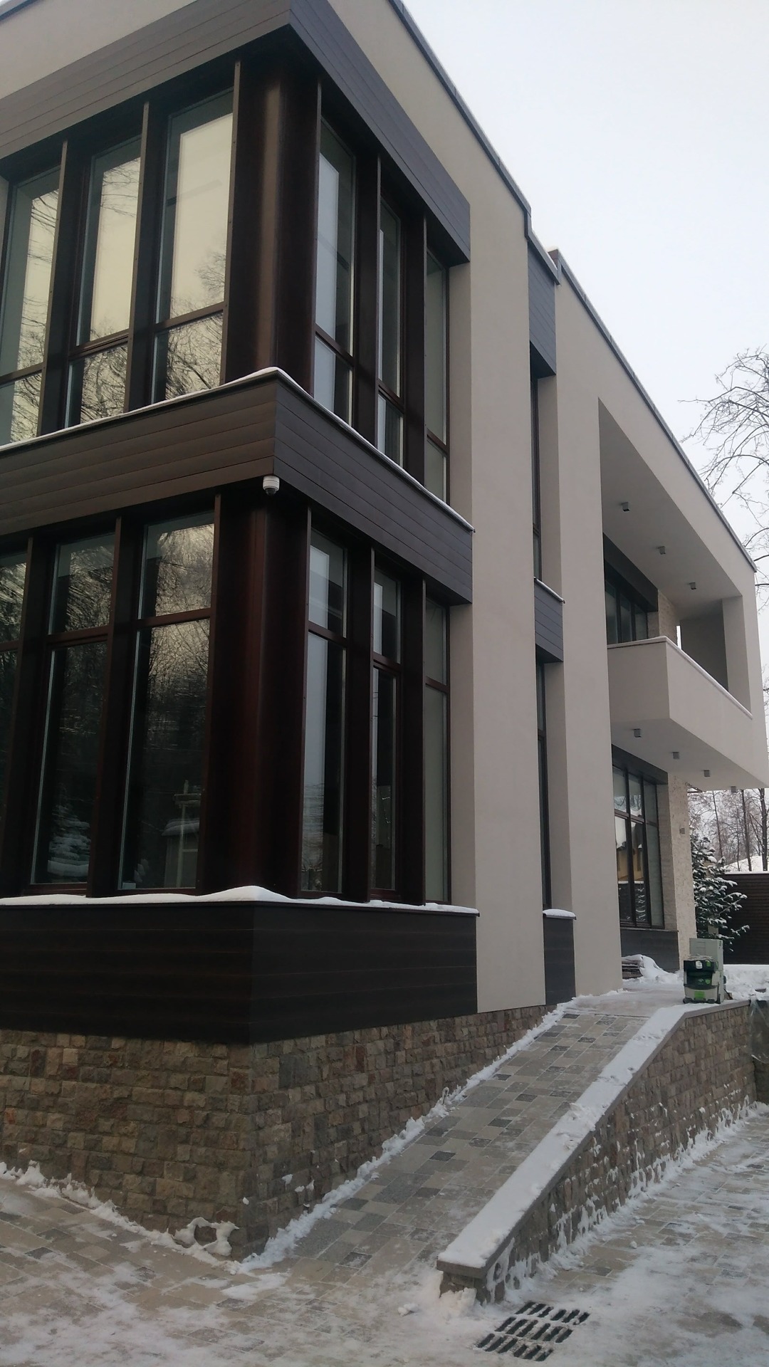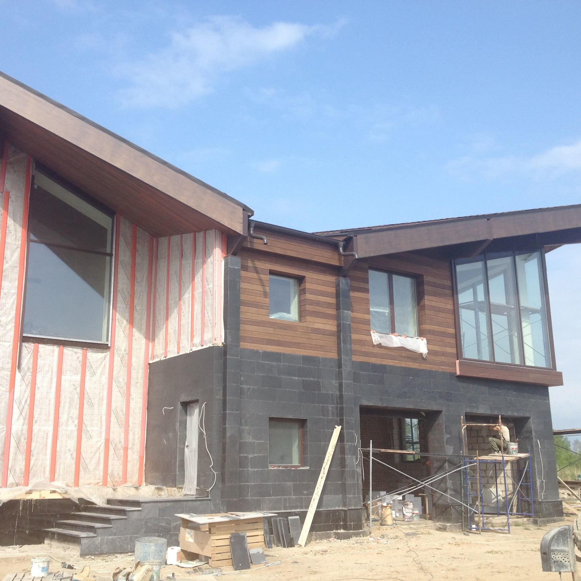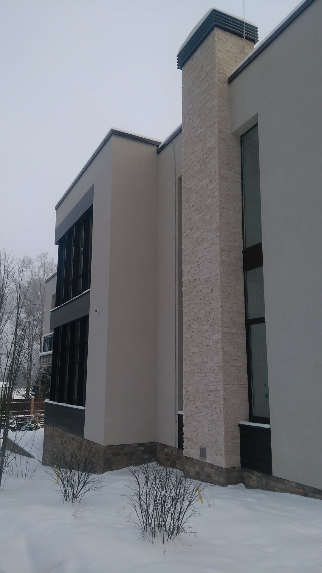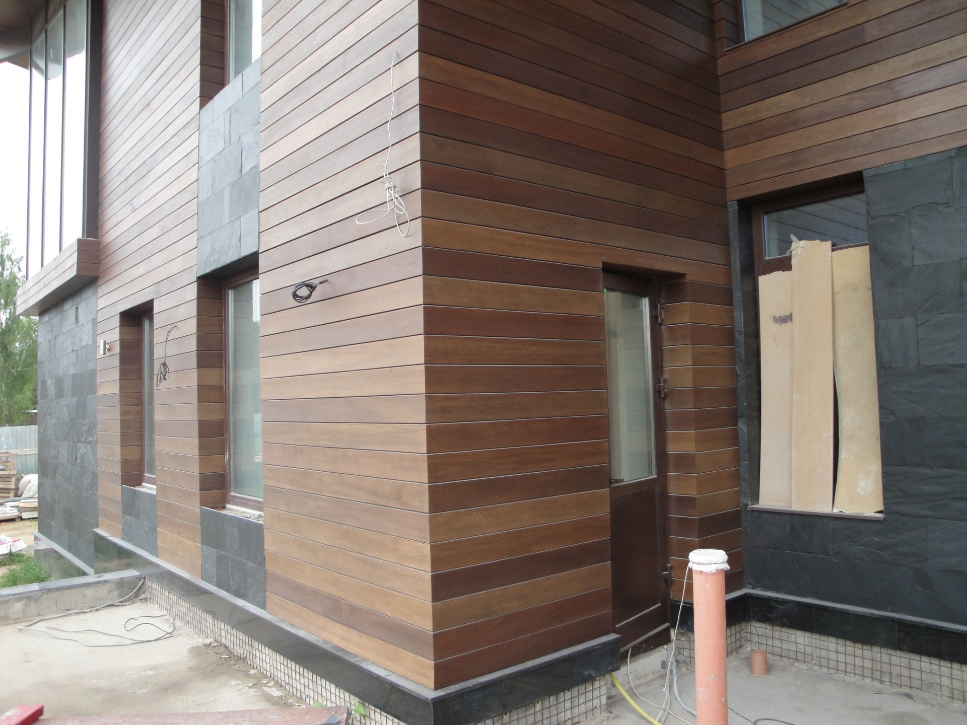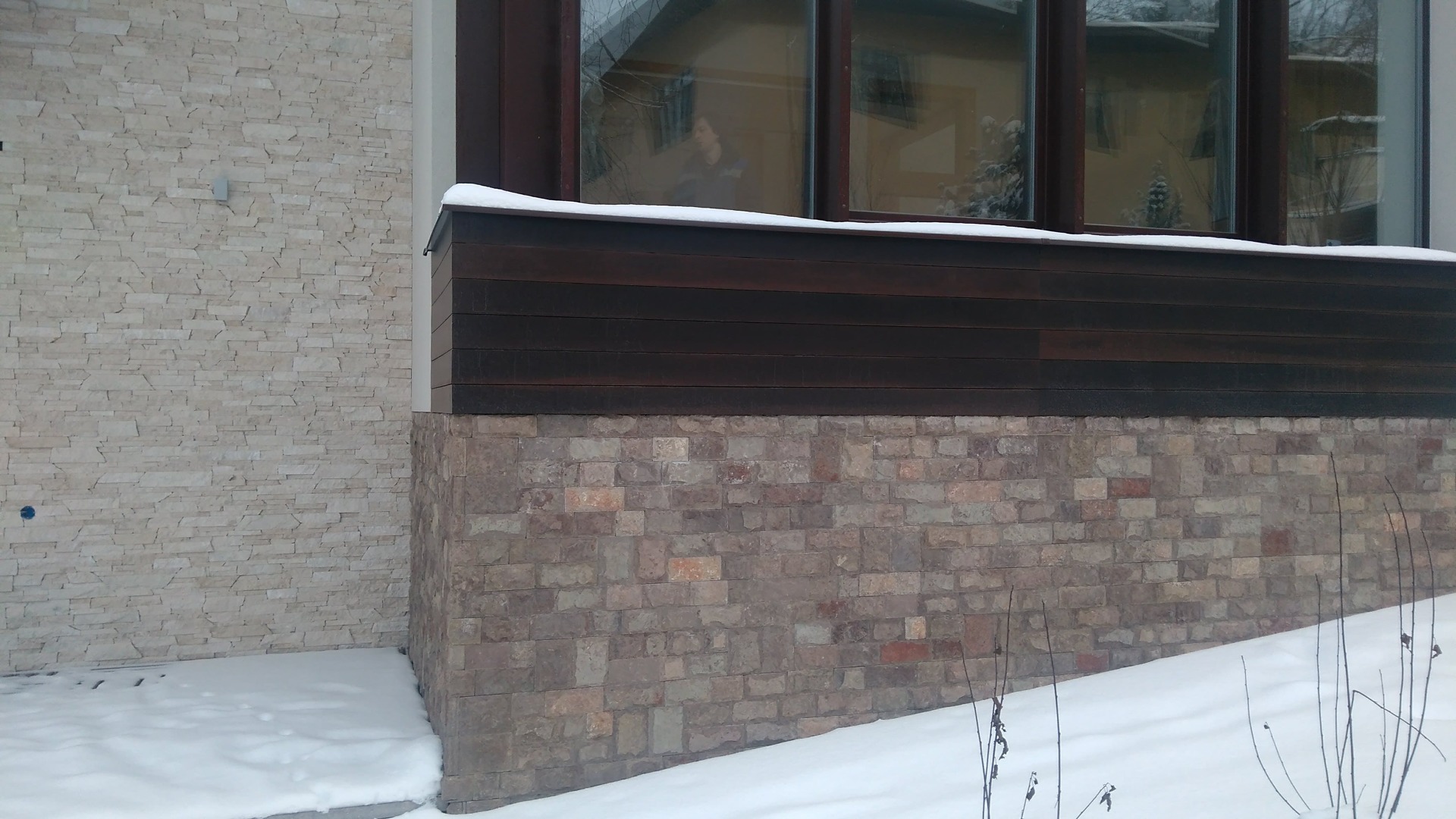 Как правило такая спешка начинает стопориться после выбора смежных материалов. Возникла проблема выбора, между экзотическим деревом и термососной. Выбрали термососну с новой схемой крепления. Производитель предложил крепить термодерево при помощи кляймеров. Метод оказался-так себе, Заказчик в процессе монтажа заменил на классическое крепление «змейка». Также долго согласовывалась укладка натурального камня «стрелка». Ну и само собой, все наши старания успеть до весны подготовить фасада