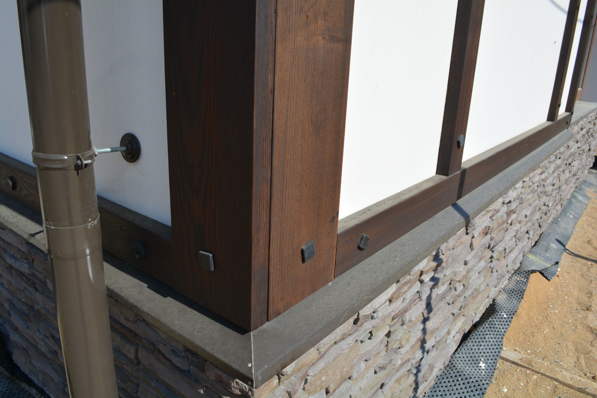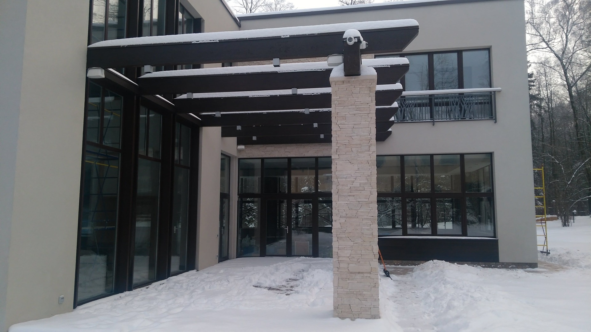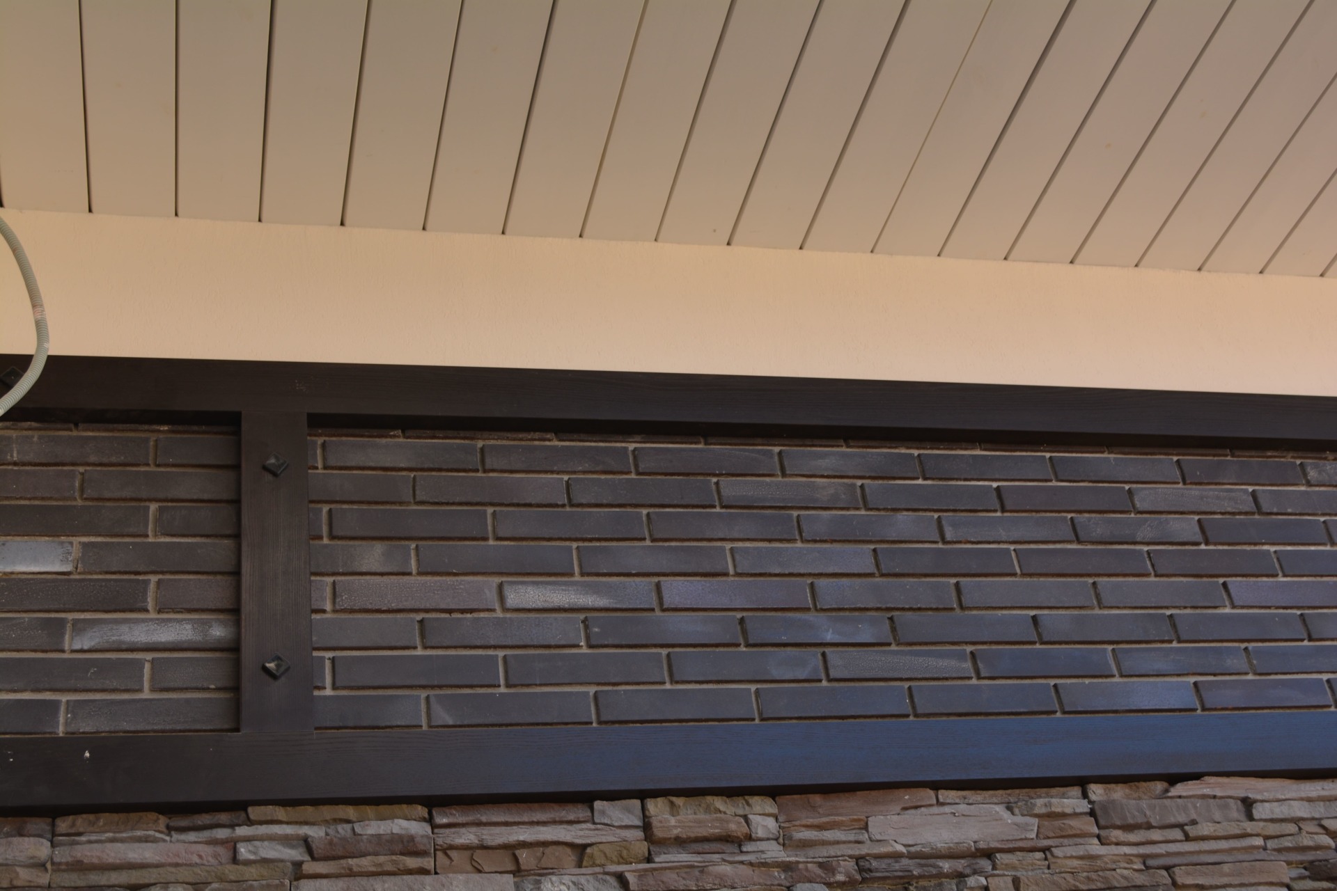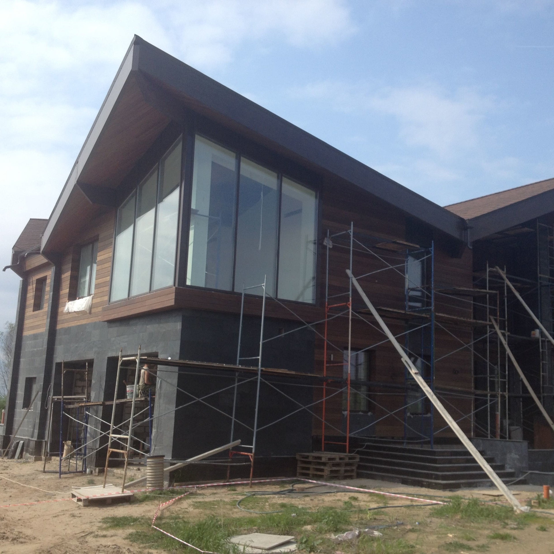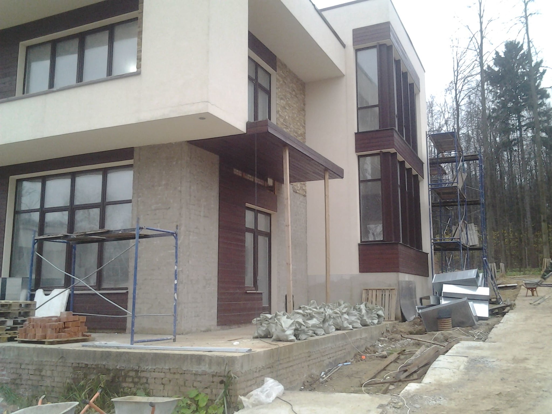 Как правило такая спешка начинает стопориться после выбора смежных материалов. Возникла проблема выбора, между экзотическим деревом и термососной. Выбрали термососну с новой схемой крепления. Производитель предложил крепить термодерево при помощи кляймеров. Метод оказался-так себе, Заказчик в процессе монтажа заменил на классическое крепление «змейка». Также долго согласовывалась укладка натурального камня «стрелка». Ну и само собой, все наши старания успеть до весны подготовить фасада