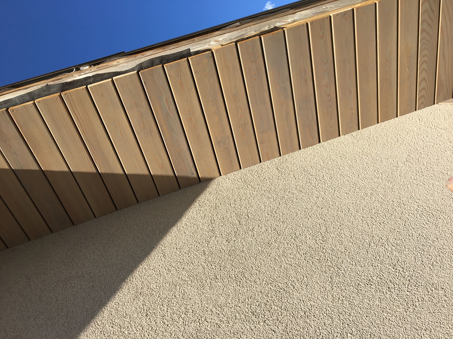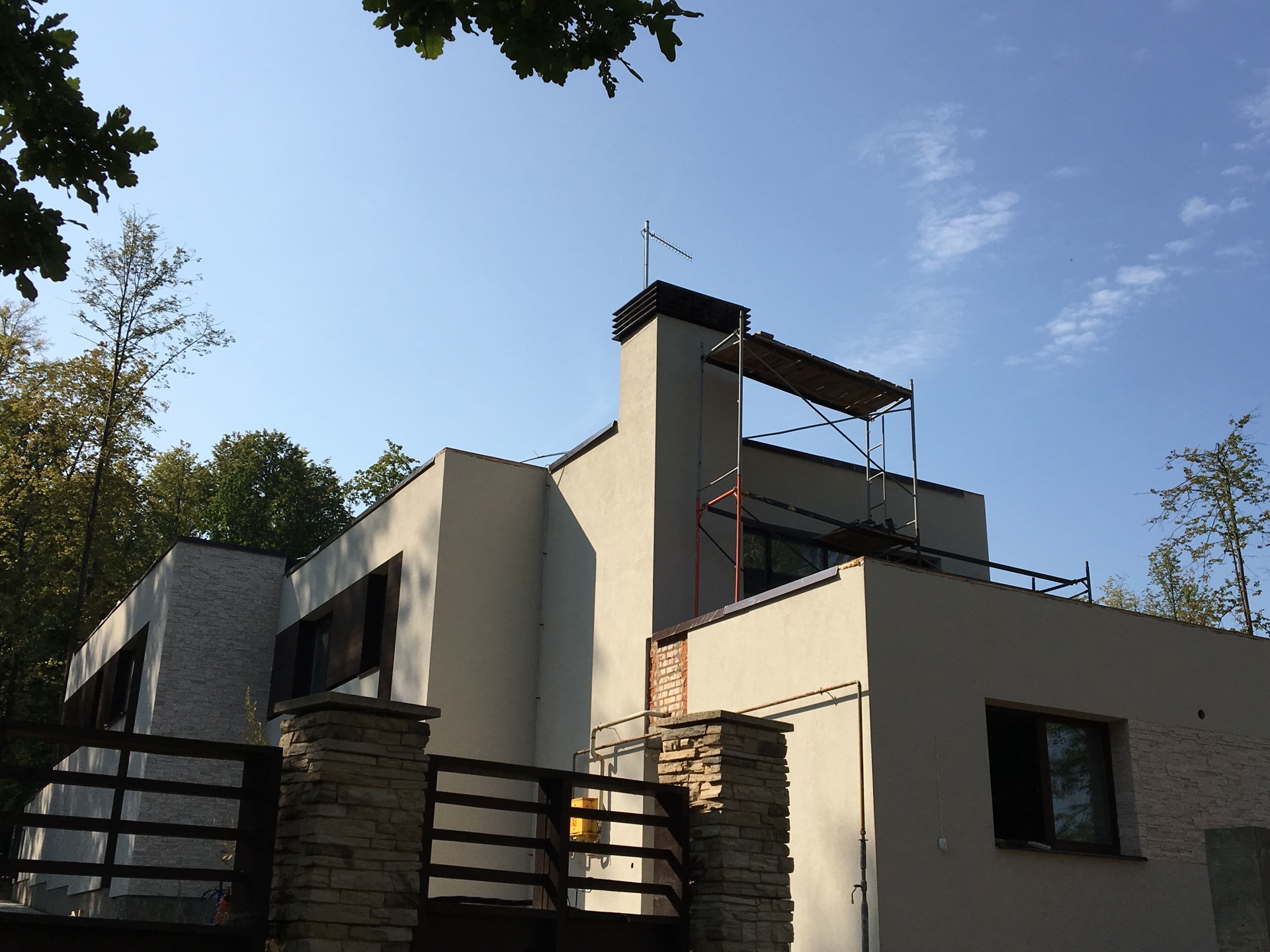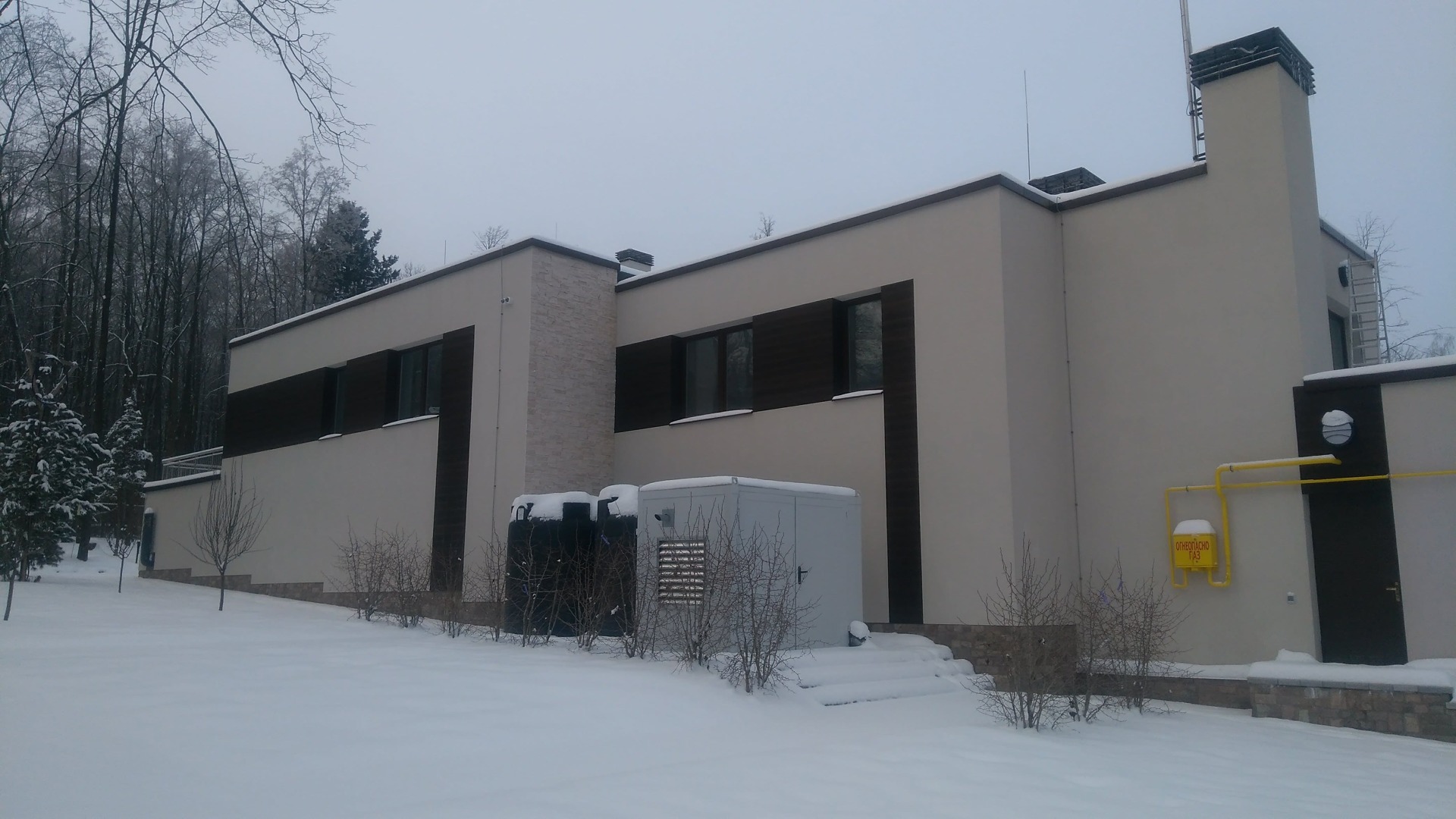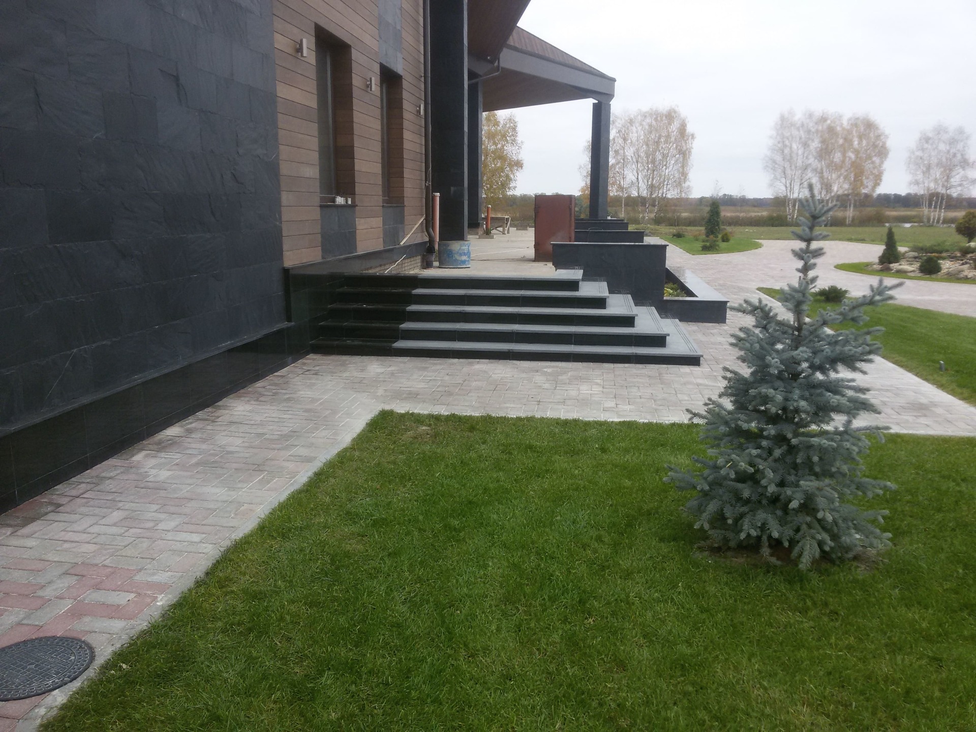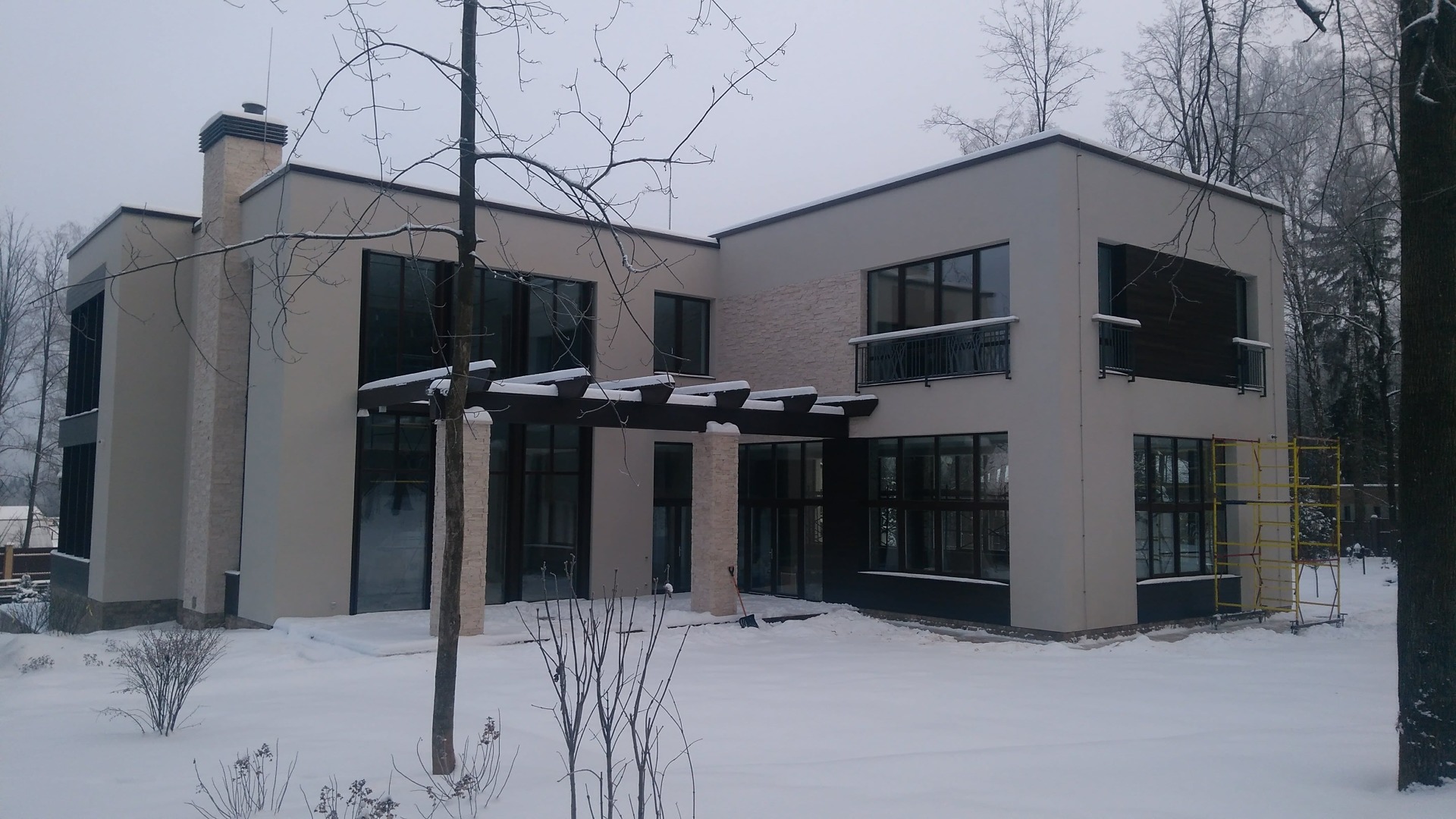 Как правило такая спешка начинает стопориться после выбора смежных материалов. Возникла проблема выбора, между экзотическим деревом и термососной. Выбрали термососну с новой схемой крепления. Производитель предложил крепить термодерево при помощи кляймеров. Метод оказался-так себе, Заказчик в процессе монтажа заменил на классическое крепление «змейка». Также долго согласовывалась укладка натурального камня «стрелка». Ну и само собой, все наши старания успеть до весны подготовить фасада