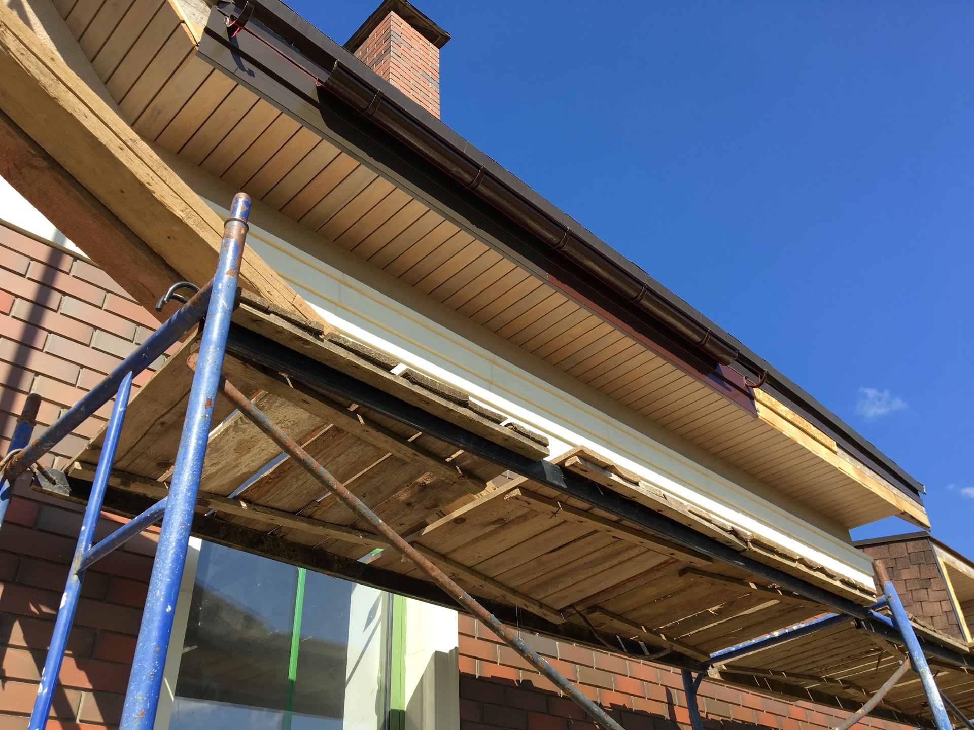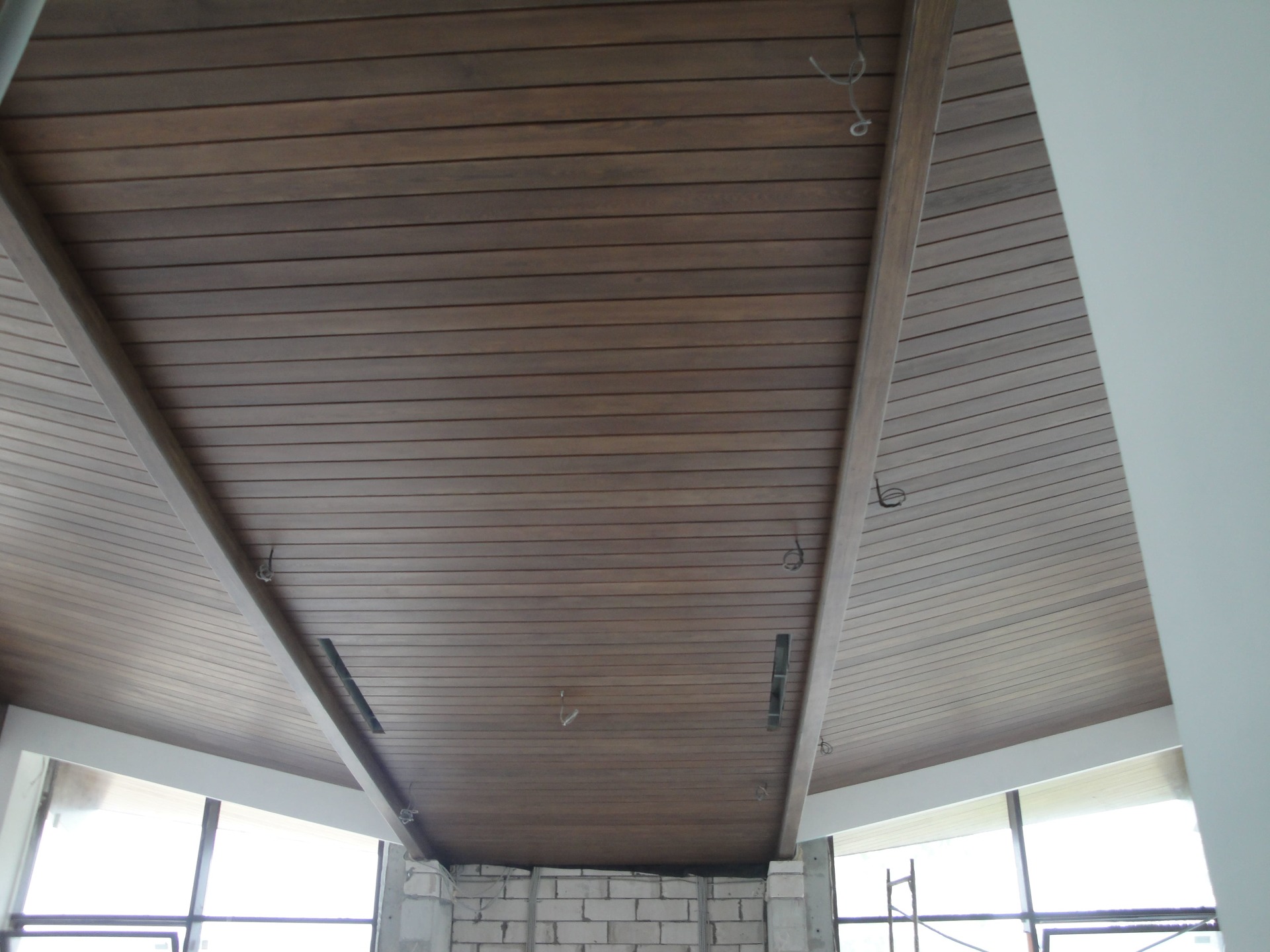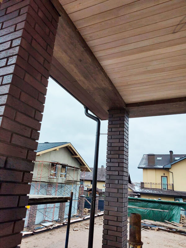 Подшивка кровельного свеса и потолка террасы планкеном из лиственницы.
