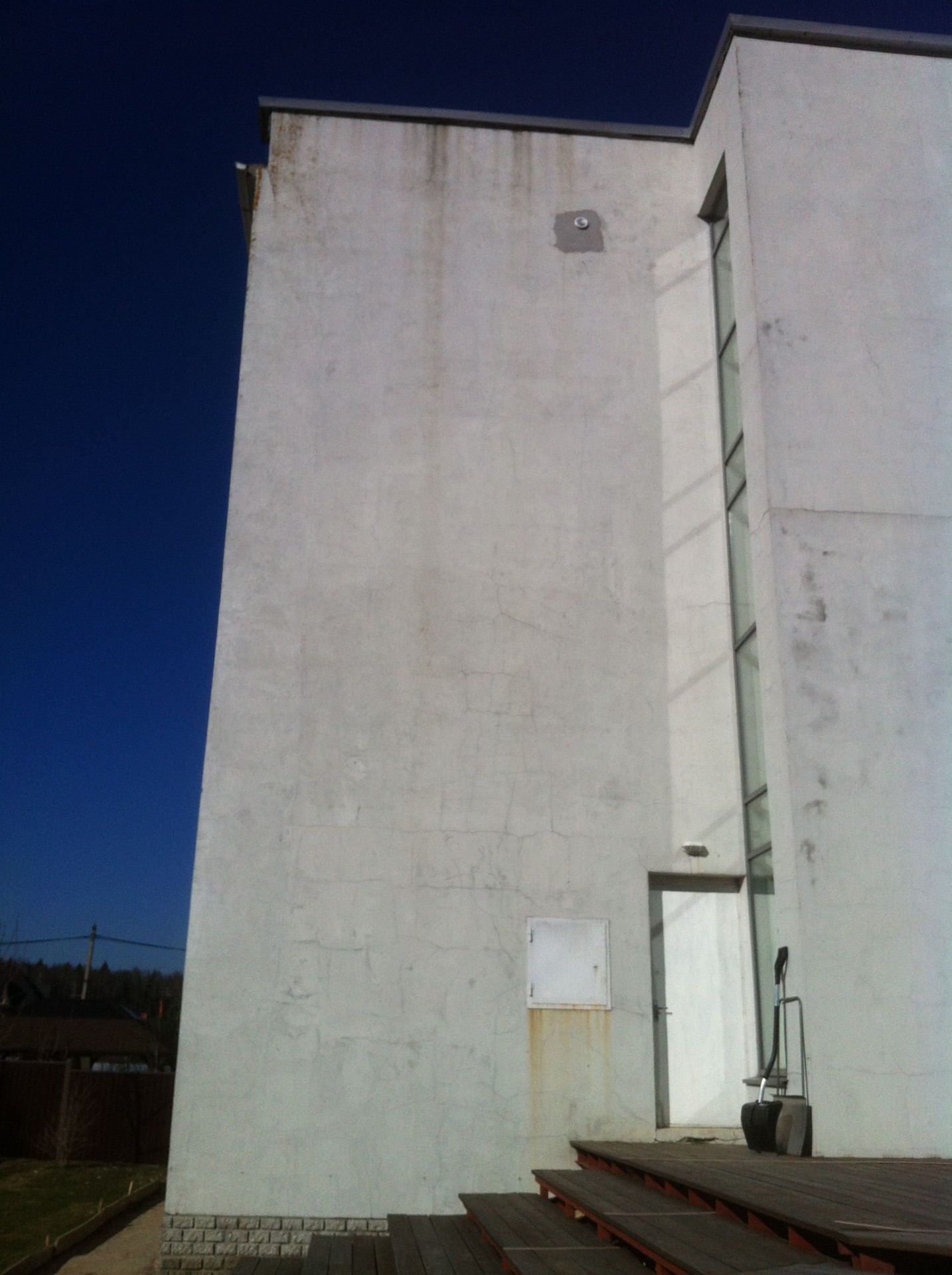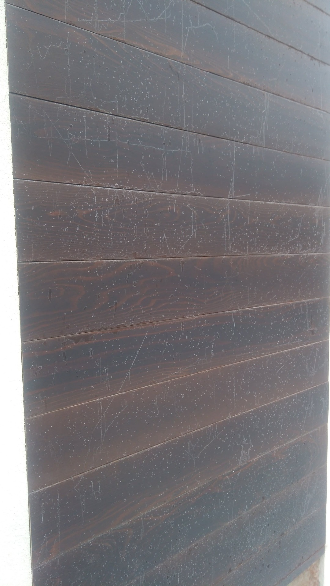 Заказчик попался требовательный, и после предыдущих исполнителей, возникла необходимость очистки фасада. Так как вероятнее всего. работы производили в осеннее-зимний период. И также, кто бы не рассказывал о стабильности термодерева, возникла необходимость его демонтажа и перекраски.